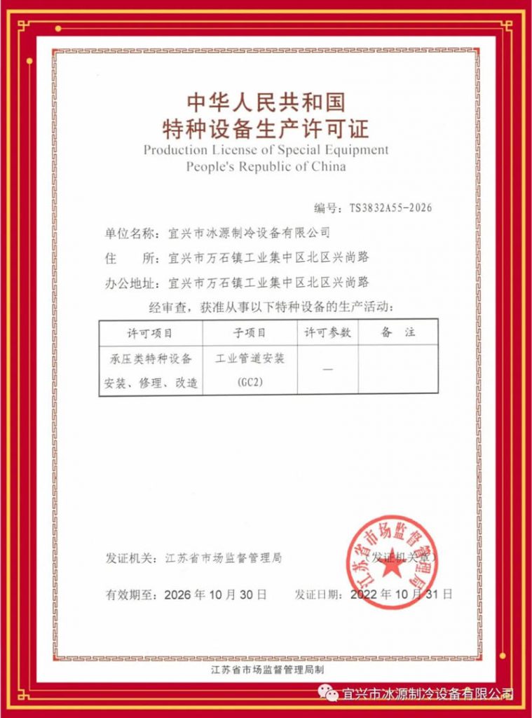 熱烈祝賀宜興冰源獲得特種設(shè)備生產(chǎn)許可證